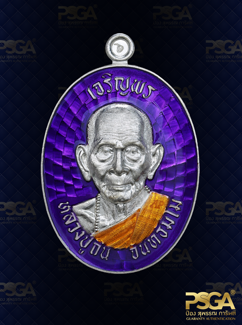 | เนื้อโลหะ / Composition | เนื้อเงิน ลงยาพื้นม่วง (สีประจำวัน) ตอก ๖ |