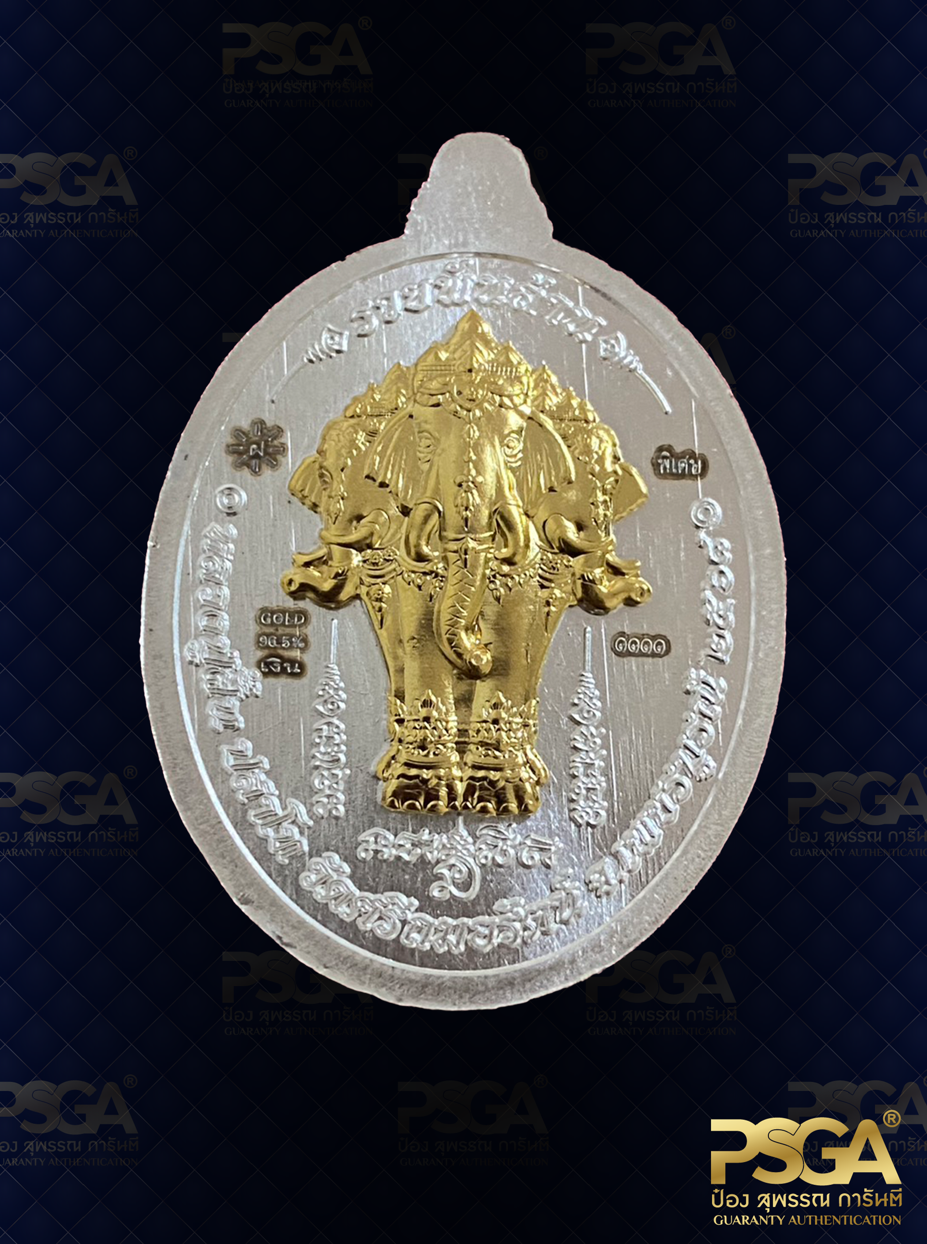 | เนื้อโลหะ / Composition | เนื้อเงิน หน้ากากทองคำแท้ 96.5% ฝังเพชรเต็มฆังฏิ พื้นเหรียญปิดแผ่นทองคำแท้ หน้ากากช้างชุบทองคำแท้ |