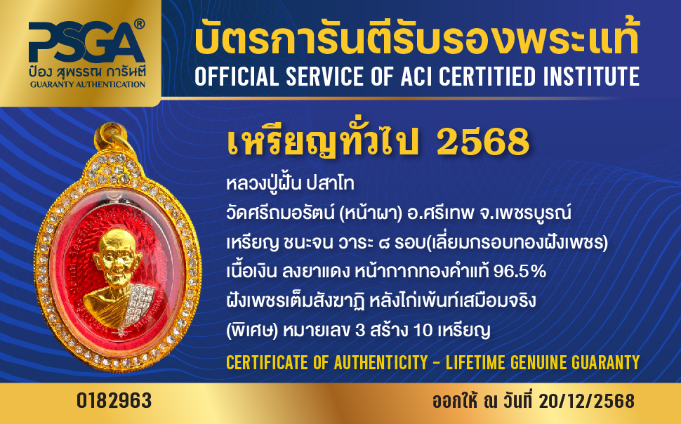 | เนื้อโลหะ / Composition | เนื้อเงิน ลงยาแดง หน้ากากทองคำแท้ 96.5% ฝังเพชรเต็มสังฆาฏิ หลังไก่เพ้นท์เสมือนจริง |