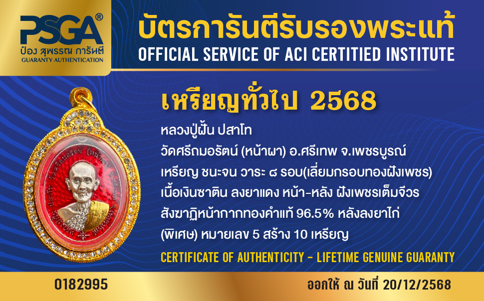 | เนื้อโลหะ / Composition | เนื้อเงินซาติน ลงยาแดง หน้า-หลัง ฝังเพชรเต็มจีวรสังฆาฏิหน้ากากทองคำแท้ 96.5% หลังลงยาไก่ |
