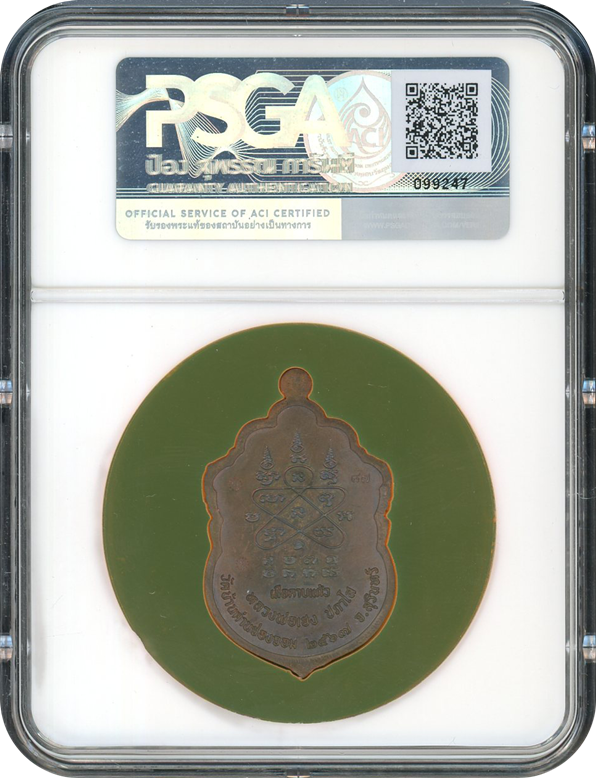 | เนื้อโลหะ / Composition | เนื้อนวะ ฝังแผ่นตะกรุดทองคำ พื้นส้ม ขอบขาว ซุ้มแดง |