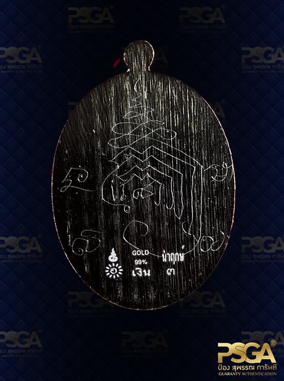 | เนื้อโลหะ / Composition | เนื้อเงิน ชุบทองคำแท้ ตอก ๑๖๘ หน้ากากชุบทองคำแท้ จารมือเกจิ |